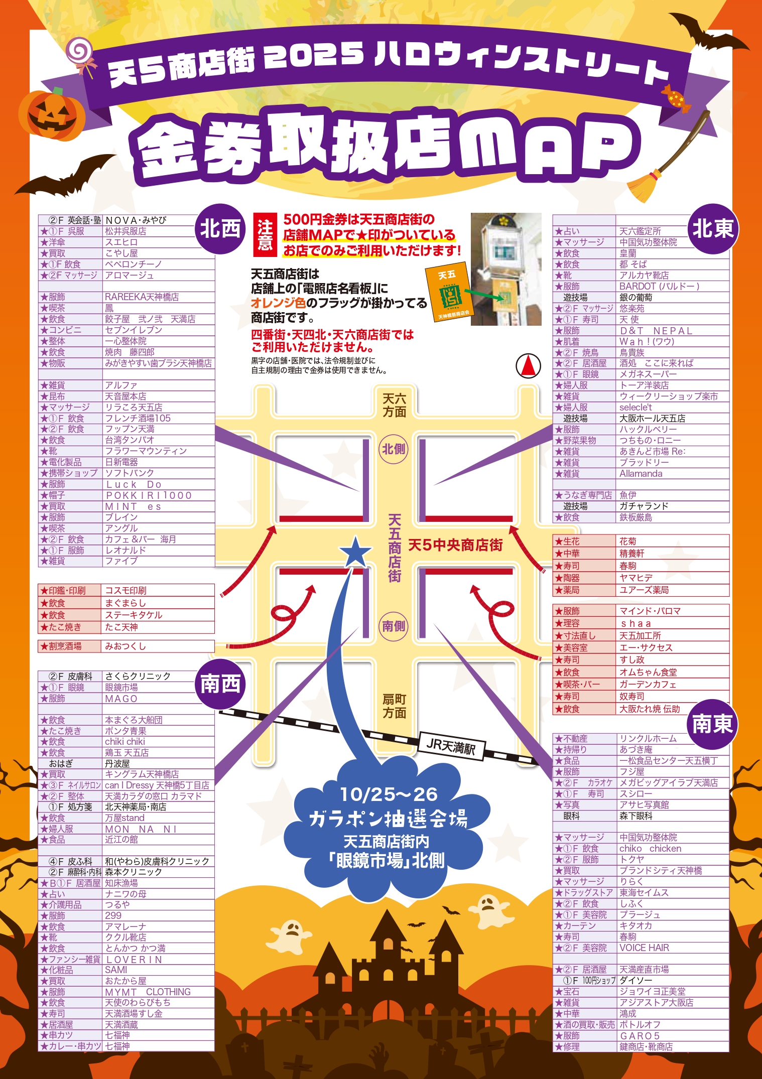 賞品は「天五商店がで使える500円金券」で、ハズレでも現金100円が必ず当たる大盤振る舞い!この2日間はガラポン抽選会以外にも、お子様対象のフェイスペインティングやキャンディを配りながらのパレードなどなどを行いますので、ぜひ天五商店街へお越しください。お待ちしております。